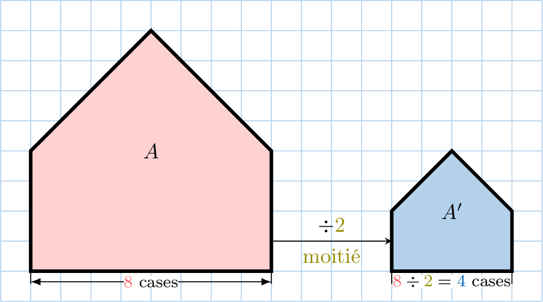 Le rectangle \( A \) est agrandi en \( A' \) en doublant les longueurs de ses côtés (en les multipliant par 2). Remarque comment la largeur et la hauteur doublent.
