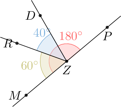Calcule la mesure de \(\AngleFr{DZP}\) en soustrayant les angles connus de l’angle plus grand en utilisant le postulat de l’addition des angles.
