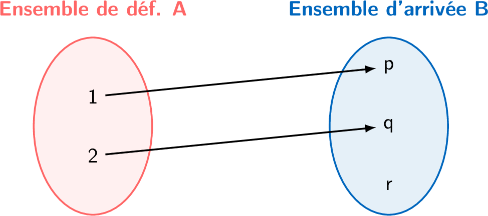 Soit \(A = \{1, 2\}\) et \(B = \{p, q, r\}\). Une fonction \(g:A\rightarrow B\) est définie par le diagramme de correspondance ci-dessous.