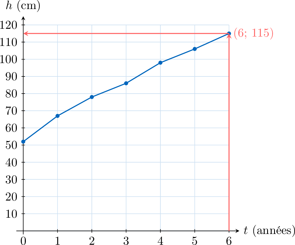 Le point obtenu est \((6;115)\), donc la taille de Hugo à \(6\) ans est \(h = 115\) cm.