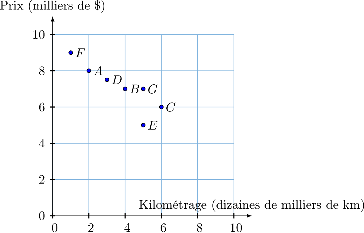 Scénario : Vous analysez des données sur des voitures d'occasion, en traçant le prix en fonction du kilométrage.