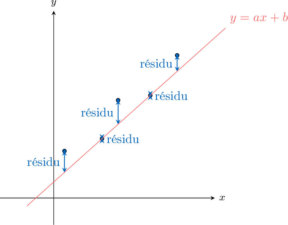 résidu est la distance verticale entre un point de donnée observé \((x_i, y_i)\) et le point prédit sur la droite de régression \((x_i, \hat{y}_i)\).$$ \text{Résidu} = y_{\text{observé}} - y_{\text{prédit}} = y_i - \hat{y}_i $$Une propriété clé est que la droite de régression des moindres carrés passe toujours par le point moyen, \((\bar{x}, \bar{y})\).