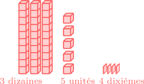 • Forme décomposée :$$\begin{aligned} 3\text{ dizaines} &+ &5\text{ unités} &+& 4\text{ dixièmes} \\ 30 &+& 5 &+& \frac{4}{10}\end{aligned}$$